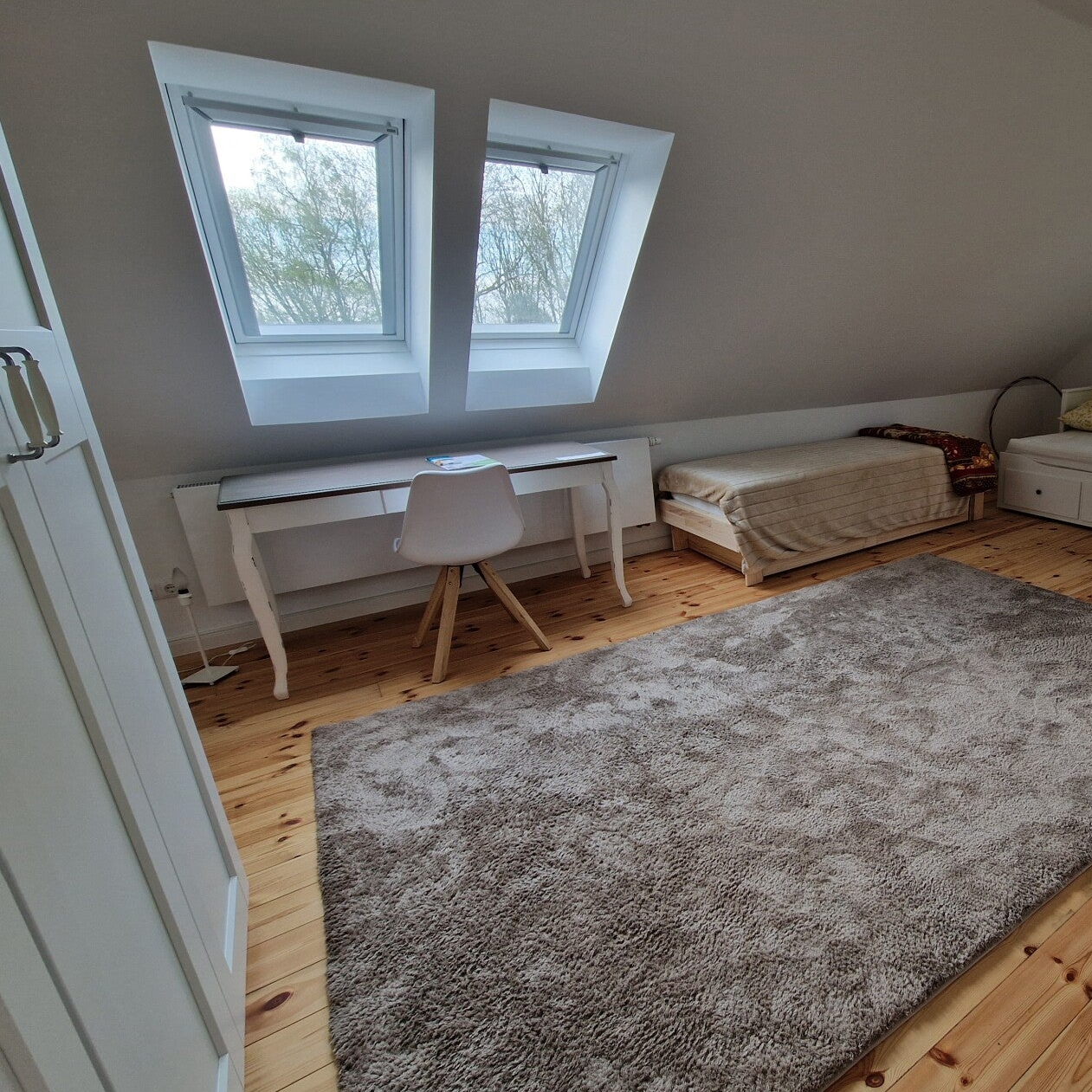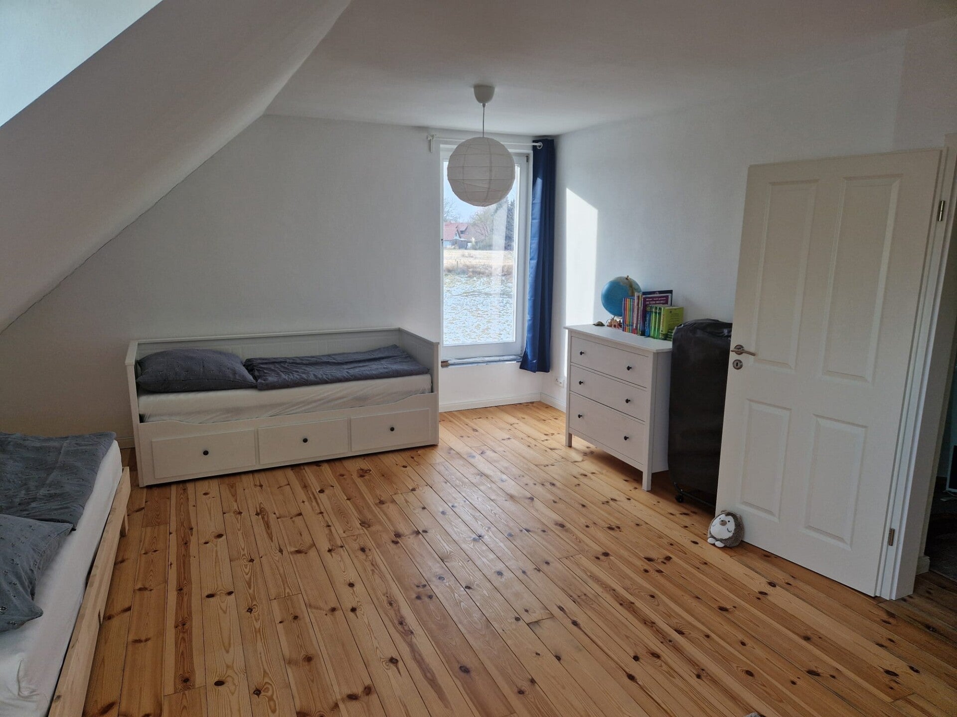 Obergeschoss: Ein weiteres großes und helles Zimmer mit Schlafgelegenheiten für vier Personen, einem weiteren Zustell-Gästebett, Kommode, Kleiderschrank und Schreibtisch.